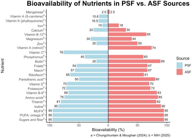 As nutrient bioavailability varies substantially between plant-source foods (PSFs) and animal-source foods (ASFs), accounting for these differences has important implications for global nutrient supplies, sustainable food systems, food systems modelling, and the environmental costs associated with their production.