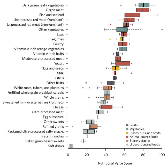✅Organ meats, dark green leafy vegetables, fish, and seafood as the highest-scoring foods.